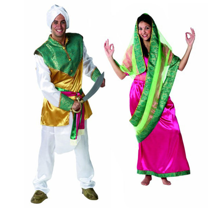 O disfarce homem inclui: jaqueta, calça, turbante e cinto, enquanto o vestido da mulher contém: Vestido e véu.