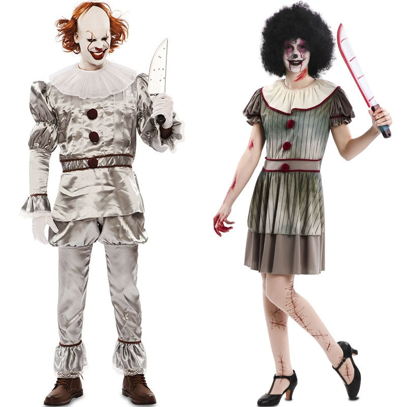 O disfarce homem inclui: camisa, calças e acessório de colarinho, enquanto o disfarce da mulher contém: vestido.