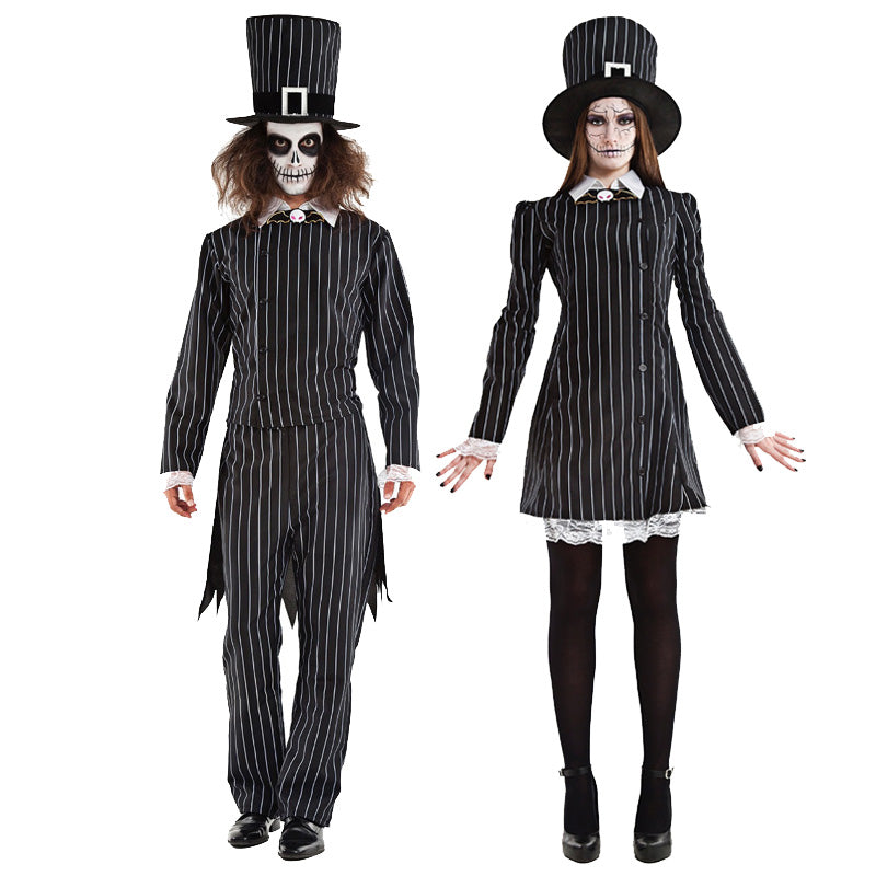 O disfarce de Mister Gribone Halloween para homens inclui: jaqueta, calça e chapéu, enquanto o disfarce de Miss Grimbone Halloween para mulheres inclui: vestido e chapéu.