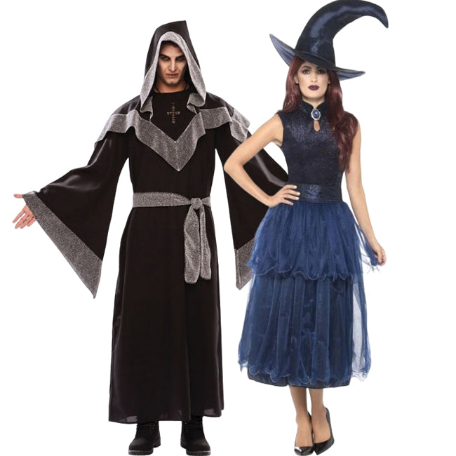 O fato de Feiticeiro Negro para homem inclui: túnica, capuz e cinto, enquanto o fato de Feiticeira Meia-Noite para mulher contém: vestido, cinto e chapéu.