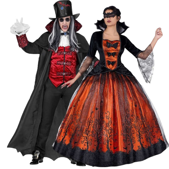 O disfarce de Halloween de Lorde Vampiro para homem inclui: sobretudo com colete e cartola, enquanto o disfarce de Rainha das Trevas para mulher contém: vestido, máscara e anágua.