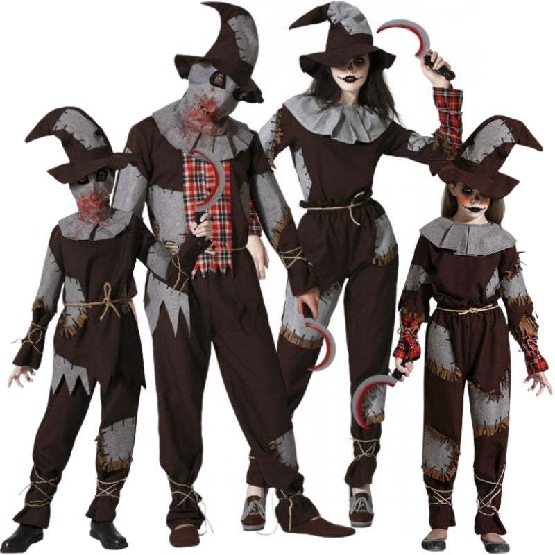 Ideia fantástica de disfarce para vestir toda a família de Espantalhos Sangrentos com modelos a combinar para homens, mulheres, rapazes e raparigas.