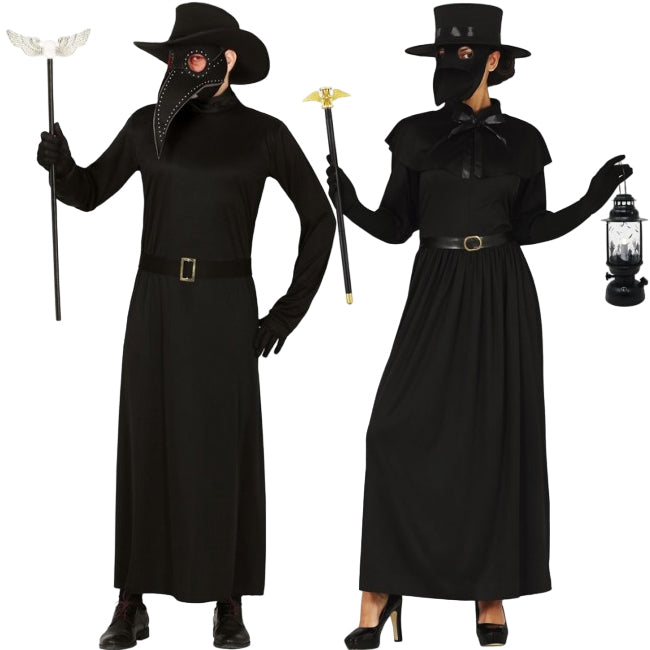 O disfarce de Médico da Peste Negra para homem inclui: chapéu, máscara, túnica e cinto, enquanto o disfarce de Médica da Peste Negra para mulher inclui: vestido, cinto, chapéu e máscara.