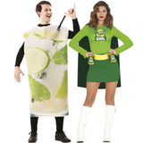 O disfarce de mojito cubano para homem e mulher inclui: fato estampado na frente. O disfarce de Capitã Mojito para mulher inclui: vestido com cinto e capa.