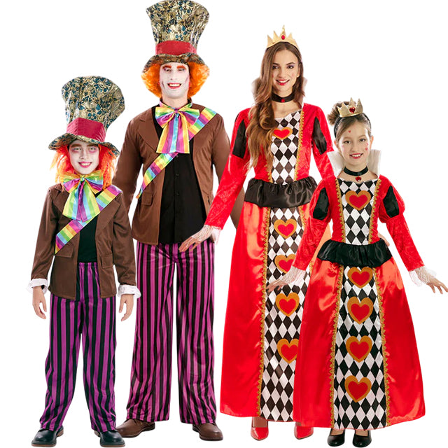 Ideia fantástica para fantasiar toda a família de Chapeleiros e Rainhas de Copas com designs combinados para homem, mulher, menino e menina. Pode aceder ao conteúdo de cada fantasia mais abaixo na seção “Completa o teu look”, onde cada fantasia pertencente a este grupo aparece individualmente.