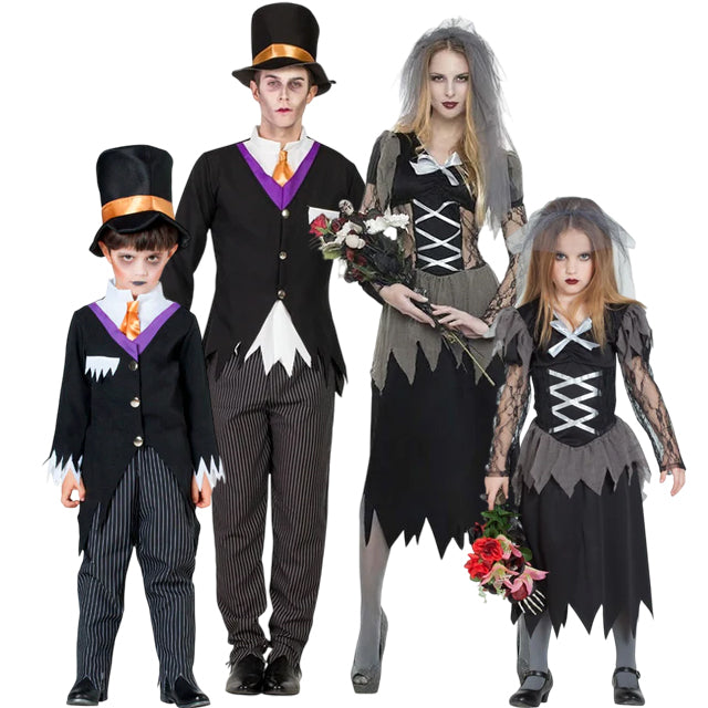 Ideia fantástica para fantasiar toda a família de Noivos Cadáver com designs combinados para homem, mulher, menino e menina. Pode aceder ao conteúdo de cada fantasia mais abaixo na secção “Completa o teu look”, onde cada fantasia pertencente a este grupo aparece individualmente.