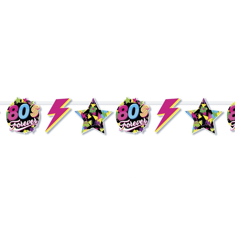Não perca a oportunidade de criar um ambiente retrô dos anos 80 com esta guirlanda para decorar a sua festa. Certifique-se de chamar a atenção de todos os seus convidados e crie memórias inesquecíveis com esta decoração incrível.