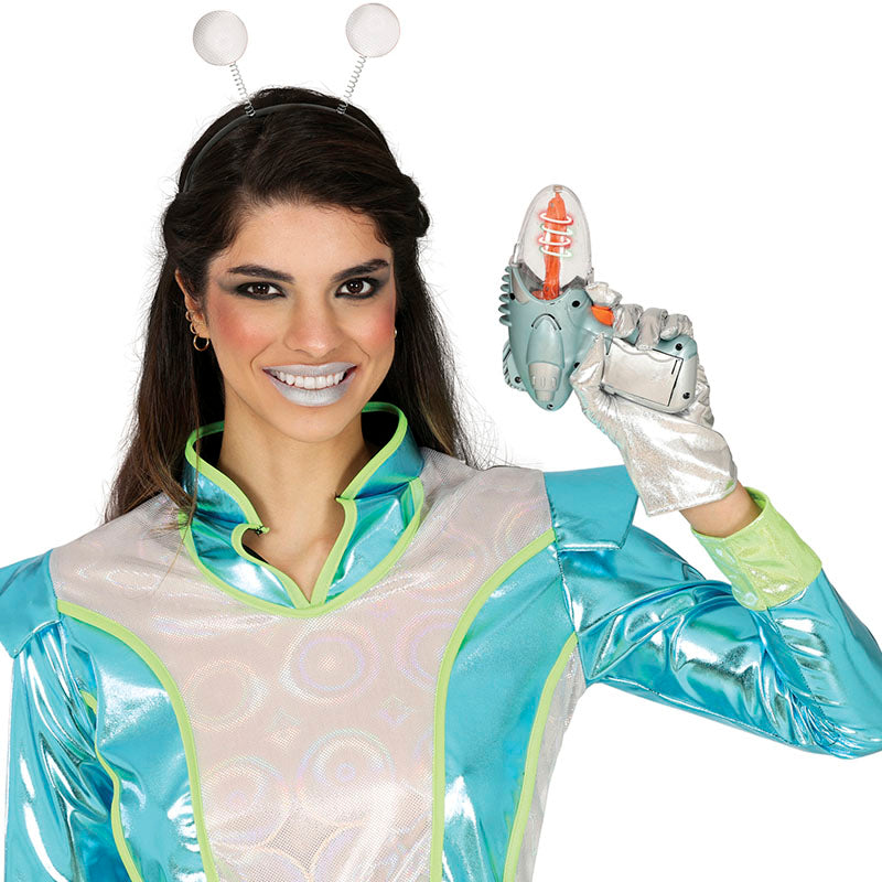 Pistola espacial prata é o toque original perfeito para completar a sua fantasia de uma forma marcante e colorida em qualquer evento de fantasia, carnaval ou festa de fantasia
